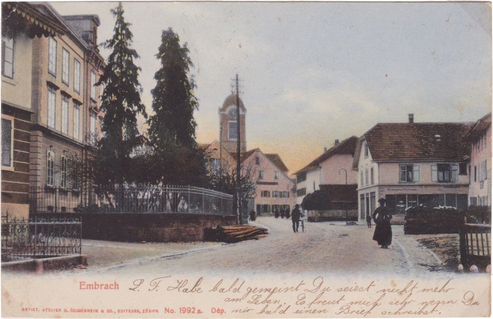 Dorfstrasse mit Schulhaus, Kirche, Restaurant Linde. Rechts Dorfstrasse 5 "Eisenwarenund Werkzeuge". Holzbeigen, Brennholz. Velo. Kinder. Postkarte "artist. Atelier M. Guggenheim Zürich".