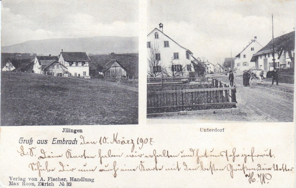 Illingen und Unterdorf. Links Haldenstrasse 1, rechts Dorfstrasse 56. Kühe. Vorgärten. Postkarte aus dem Verlag von A. Fischer Handlung, fotografiert von Max Roon, Zürich. Quelle: Sammlung Hans Baer.