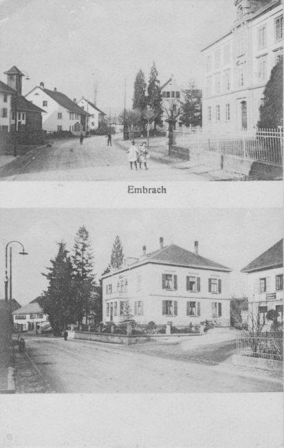 Oben Schulhaus, Dorfstrasse 10 (Schuhmacher Schenk) noch nicht gebaut. Unten Villa Ganz, Dorfstrasse 18 und Postbüro Dorstrasse 14. Kinder. Postkarte. Quelle: Sammlung Hans Baer