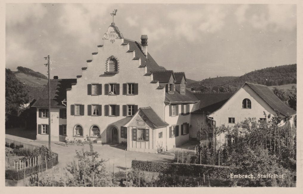 Bäckerei im Staffelhof, Pfarrhausstrasse 12. Vorgärten, Strommasten. Velos. Postkarte.