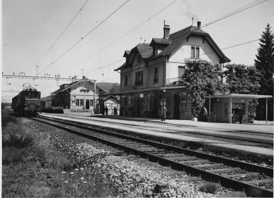 Bahnhof Embrach-Rorbas 1955. Stationsvorstand, Kiosk, Zug. Quelle: Sammlung Photoglob, Schweizerisches Nationalmuseum.
