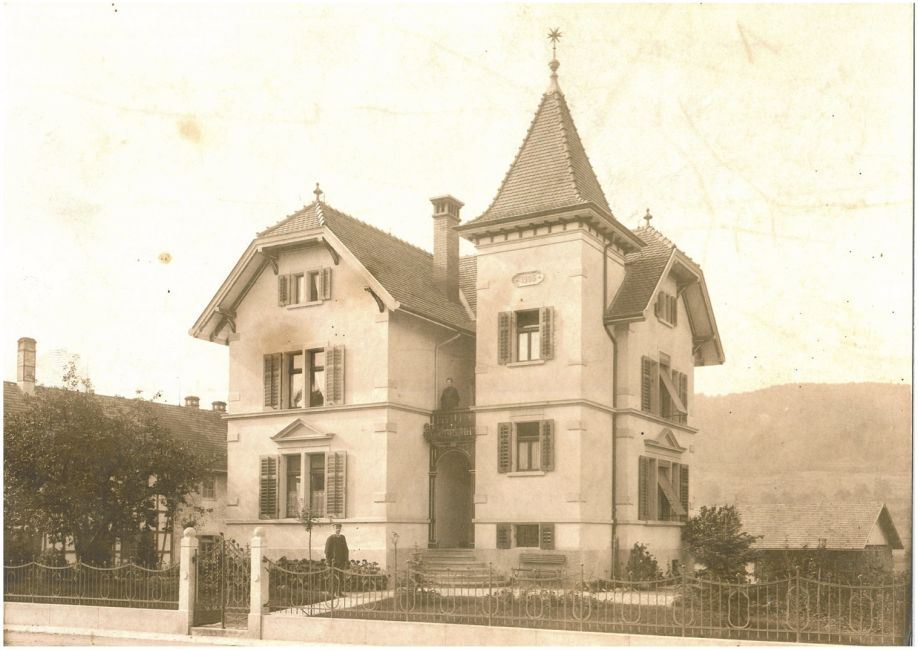 Villa Ganz, Dorfstrasse 111, erbaut 1906. Links Ofenfabrik Ganz. Vorgarten mit Rasen. Personen?