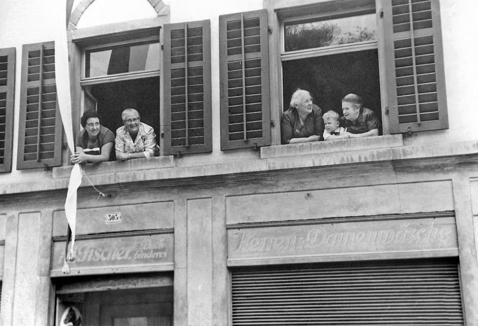 Dorfstrasse 5 bein Umzug August 1965, Handlung Fischer, Buchbinderei, Damen- und Herrenwäsche. Werbung für Rösslistumpen. Personen ? Quelle: Bella Neri