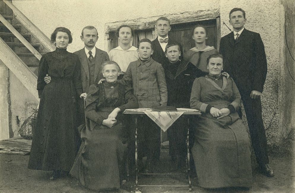 Familie Zinggeler (gesch. Schaaf) vor dem Hintereingang an der Oberdorfstrasse 44: Mutter Maria Zinggeler (gesch. Schaaf) sitzend links, Otto Zinggeler stehend rechts aussen, neben ihm Dora Zinggeler.