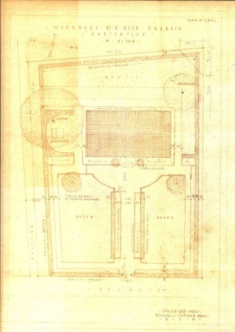 Gartenplan Villa Kolb 1921. Rasen. Vorgarten, Gemüsegarten. Quelle: Gisela Bearth. Buch Seite 28.