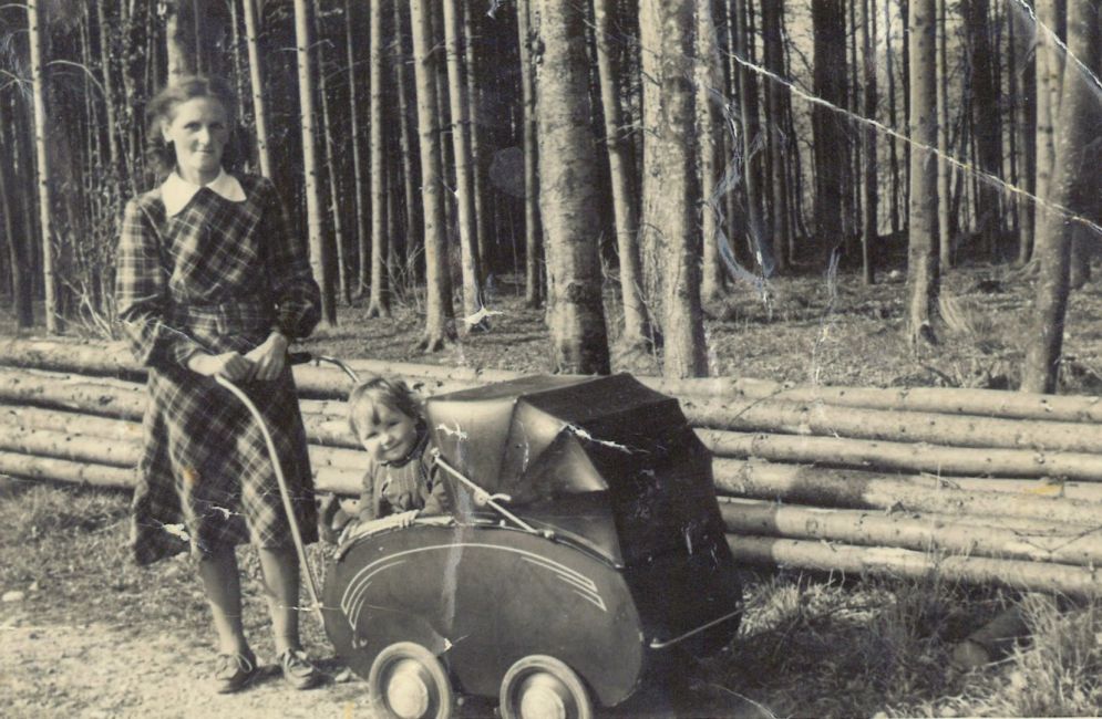 Meia Maurer (verh. Knobel) im Kinderwagen mit Mutter im Hardwald. Kinder