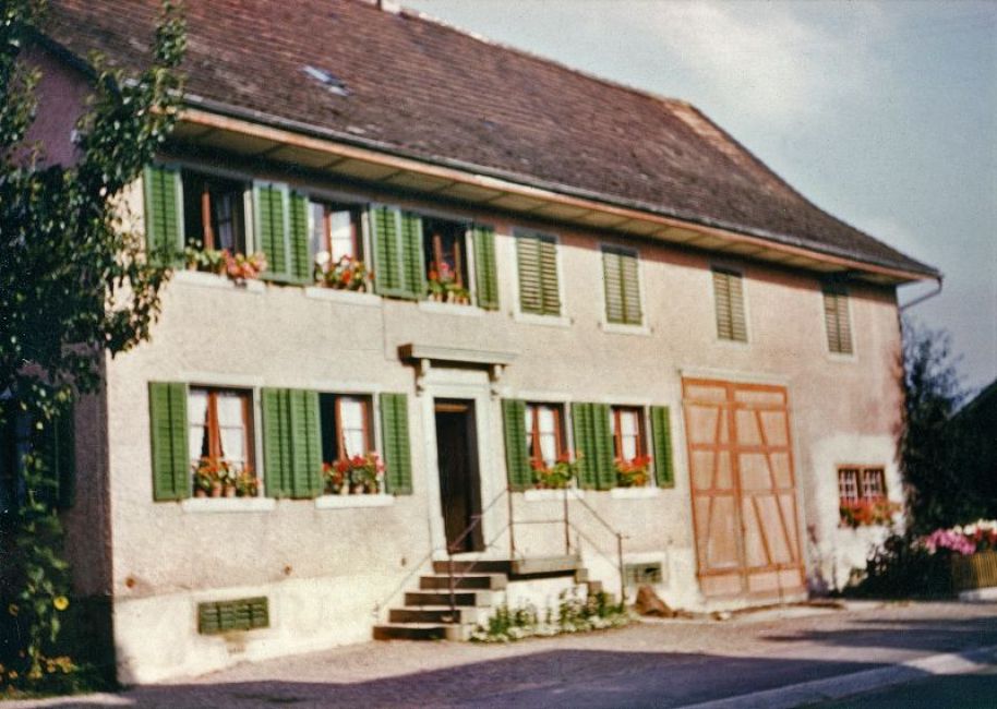 Dorfstrasse 87 ca. 1960. Familie Lienhard. Zweifamilienhaus, eine Familie rechts, eine links des Eingangs