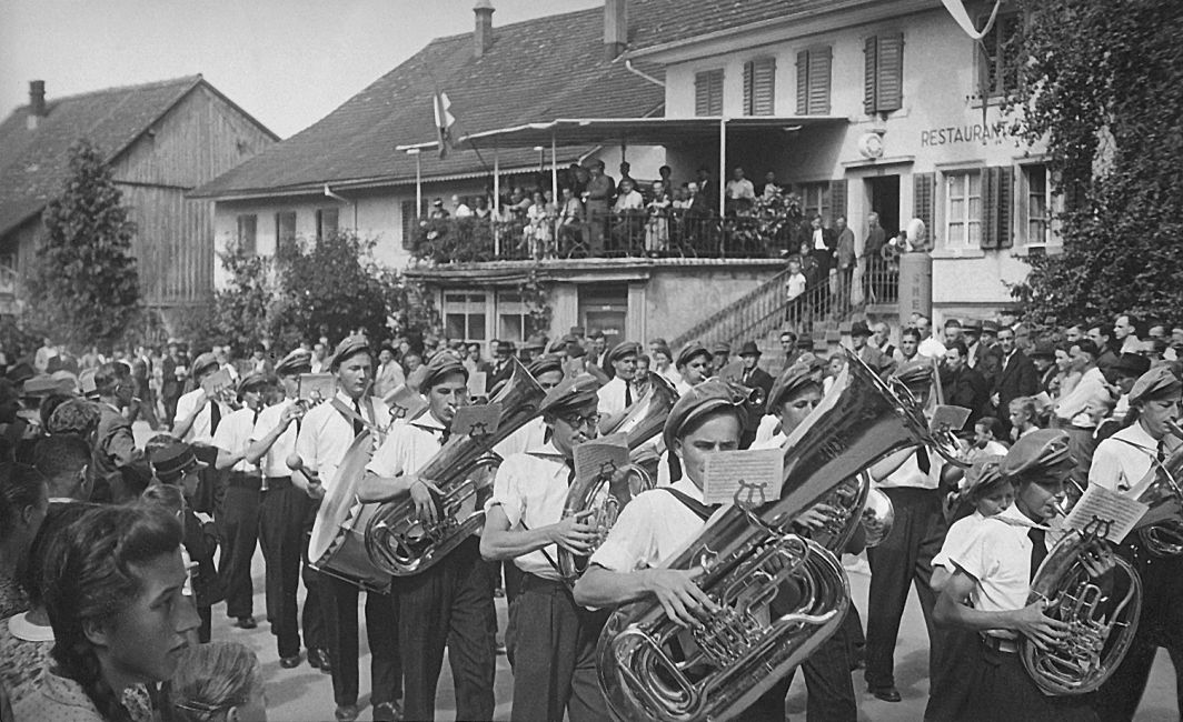 8. Unterländer Knabenmusiktag in Embrach am 20. August 1944. Marsch vom Bahnhof zum Festplatz bei der Seidenzwirnerei. Die Jury sitzt auf der Terrasse des Restaurants Frieden.