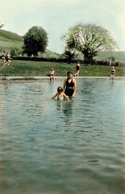 Baden im Chlostergumpen, Klostergumpen. Margrith Zanggger, verh. Gehring, mit Hütekind.