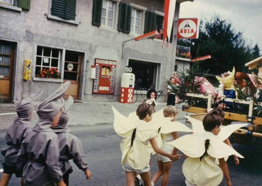Dorffest, wsch. 1960: Eröffnung des Sekundarschulhauses Hungerbühl. Avia-Tankstelle Dorfstrasse 82 ( Saurenmann )