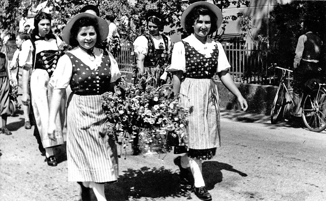 Umzug (Grund und genaues Datum unklar). Links Margrith Zangger (verh. Gehring), re Hanne Götz.Vor dem Haus Götz und Maler Bänninger (Dorfstrasse 31). Trachten