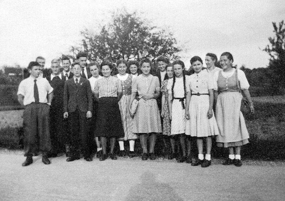 Von links: Paul Zangger (Cousin der Margrith Zangger), Erwin Zolliker (Verdingkind nach dem Tod der Mutter), Josef / Sepp Bouvard (mit Brille), Köbi Götz (re hinter Sepp Bouvard). Mit langen Zöpfen Elsi Zolliker von der Schützenhausstr. 39. Margrith Zangger 3. von rechts.