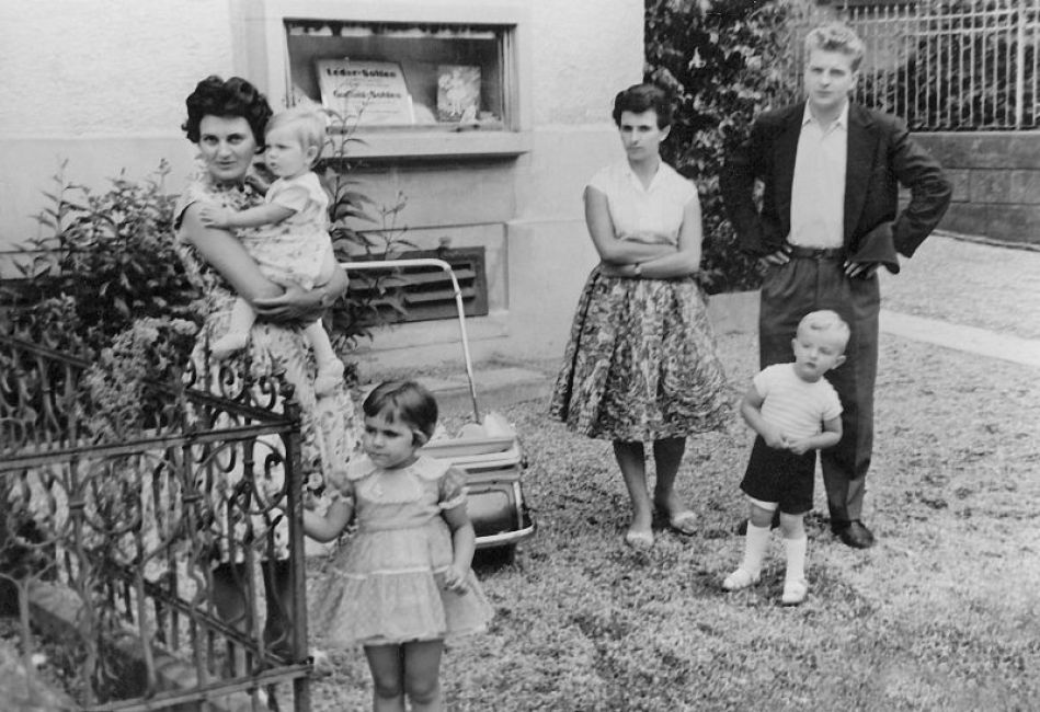 Umzug Dorffest 1965. Schaufenster von Schuhmacher Schenk an der Dorfstrasse 10. Kinder, Kinderwagen