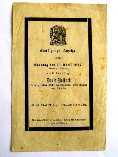 Todesanzeige David Volkart 1806-77, Ehemann der Elisabetha Baltensperger, Grossvater von Georg Volkart.