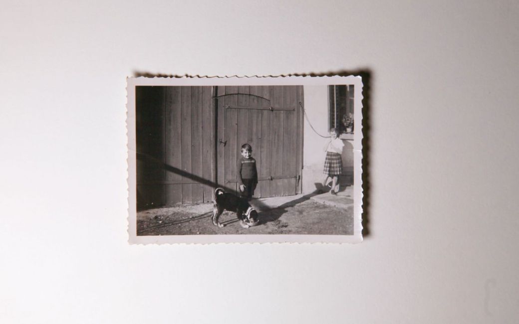 Hofhund. Köbi und Martha Peter. Hungerbühlstrasse 15, Tenntor, Hofplatz, Geranien. Quelle: Myrta Schiesser-Peter