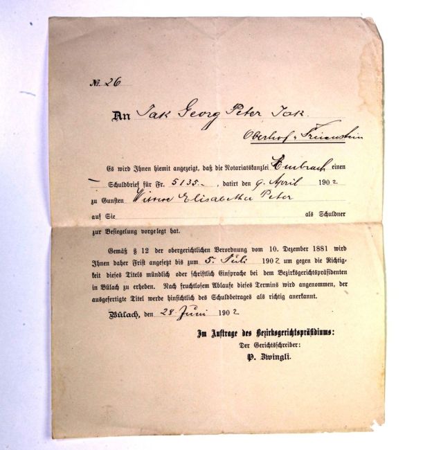 Anzeige des Bezirksgerichts über neuen Schuldbrief des Jakob Georg Peter, hinterlgt bei der Notariatskanzlei Embrach. Schulden. Schuldschein. Buch WS 135. Quelle: Familienarchiv Peter.