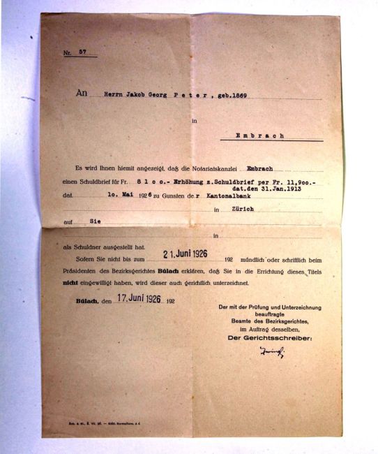 Anzeige Neuer Schuldbrief beim Notariat Embrach durch das Bezirksgericht Bülach. Jakob Georg Peter. Schulden. Schuldschein. Buch WS 133. Quelle: Familienarchiv Peter.