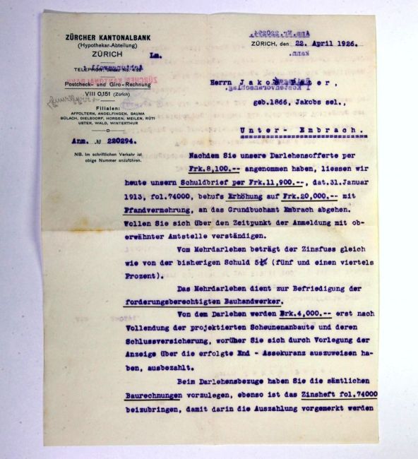Darlehensofferte Zürcher Kantonalbank 1926 für den neuen Stall, von Jakob Georg Peter akzeptiert. Schulden. Buch WS 132. Quelle: Familienarchiv Peter.