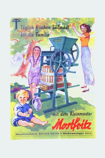 Frischer Süssmost. Werbeflyer für den Mostfritz von Bucher-Guyer, Niederweningen. Obstbau.