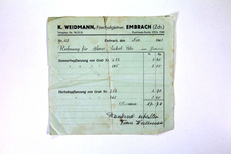 Gärtnerei Weidmann an der Haldenstrasse. Sommerbepflanzung und Herbstbepflanzung für die Gräber von Jakob Georg Peter und seiner Frau. Bezahlt an Frau Weidmann. Quelle: Familienarchiv Peter.
