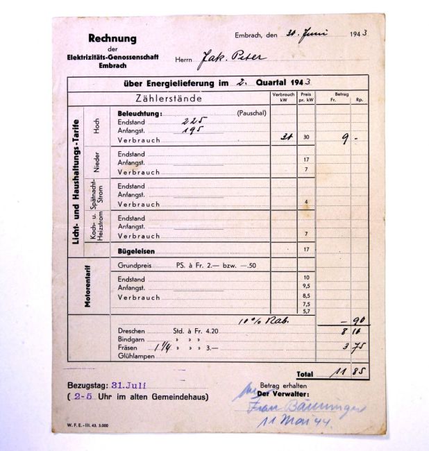 Stromrechnung von der Elektrizitätsgenossenschaft 2. Quartal für Lichtstrom und Fräsen. Bezahlt an Frau Bänninger. Quelle: Familienarchiv Peter.