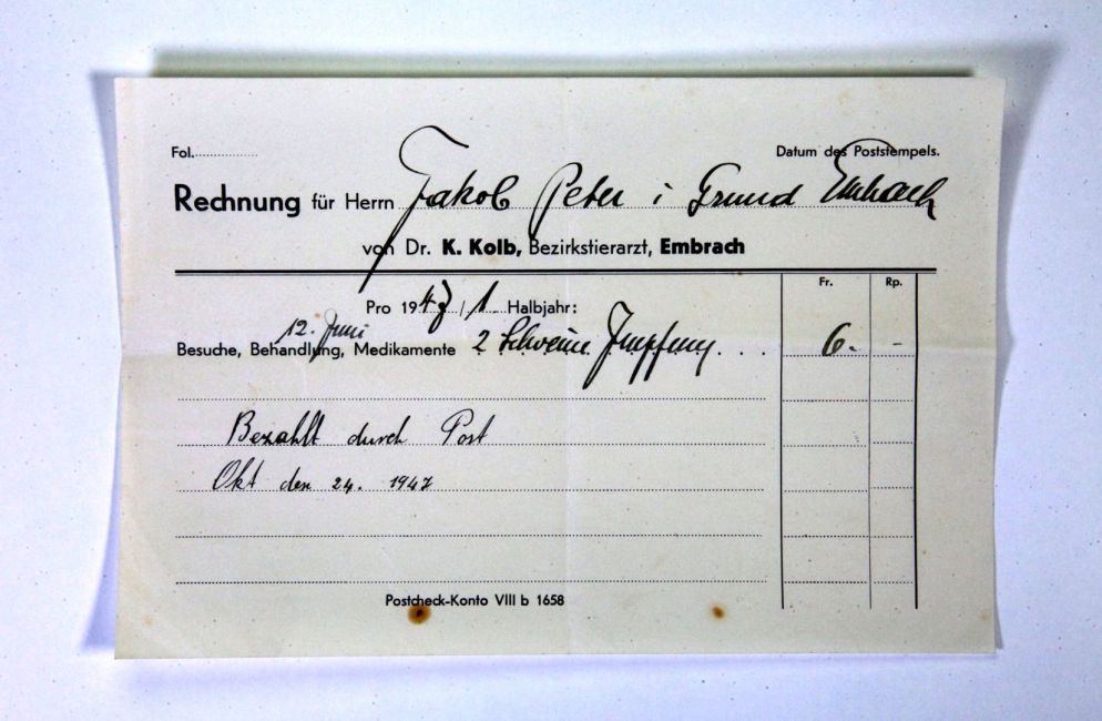 Dr. Karl Kolb, Bezirkstierarzt. Tierarzt. Schützenhausstrasse 27. Schweineimpfung. Buch Seite 121. Quelle: Familienarchiv Peter.