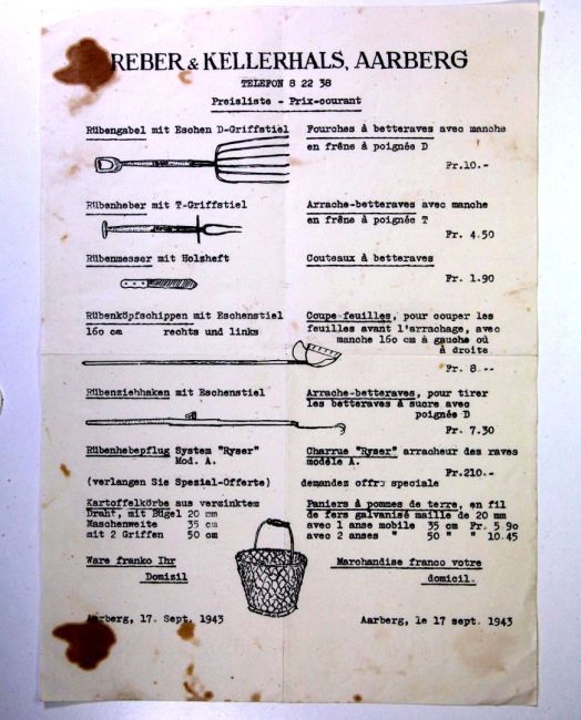 Geräte für Zuckerrübenanbau. Rübengabel, Rübenheber, Rübenmesser, Rübenziehhaken, Rübenschippe, Kartoffelkorb Draht mit Bügel. Reber und Kellerhals Aarberg. Preisliste. Buch WS 108. Quelle: Familienarchiv Peter.