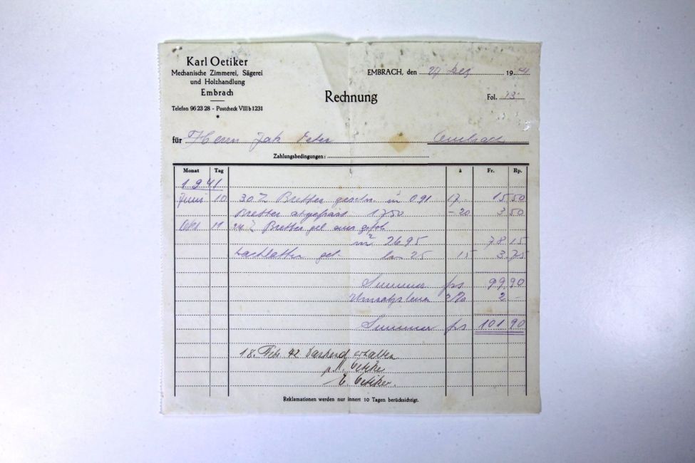 Mechanische Zimmerei, Sägerei und Holzhandlung K. Oetiker, Breitestrasse 9. Bretter, geschnitten, gefräst, geliefert. Dachlatten. Quelle: Familienarchiv Peter.