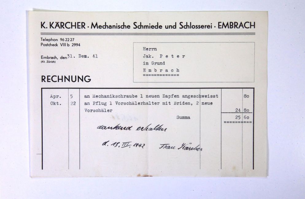 Mechanische Schmiede K. Kärcher, Pfarrhausstrasse 2. Vorschälerhalter am Pflug mit neuen Briden befestigt, 2 neue Vorschäler. Bezahlt an Frau Kärcher. Quelle: Familienarchiv Peter.