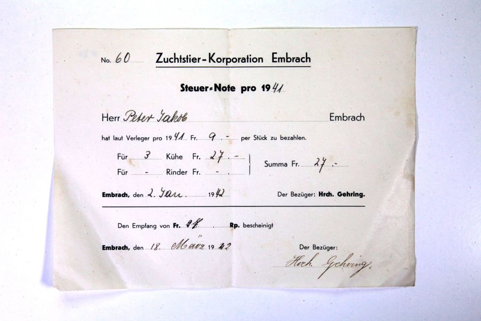 Zuchstierkorporation. Steuernote für 3 Kühe. Verwalter Heinrich Gehring. Quelle: Familienarchiv Peter