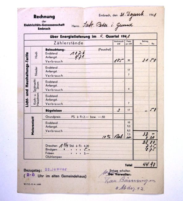 Stromrechnung der Elektrizitätsgenossenschaft für Lichtstrom, Dreschen und Bindgarn, 4. Quartal. Verwalter Frau Bänninger.