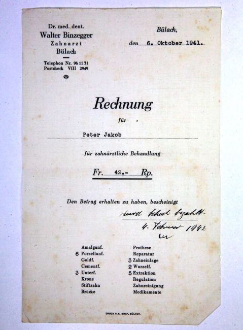 Dr. med. dent. Walter Binzegger, Bülach, an Jakob Peter. Zahnarzt. Gesundheit. Porzellanfüllung. Buch WS 8. Quelle: Familienarchiv Peter.