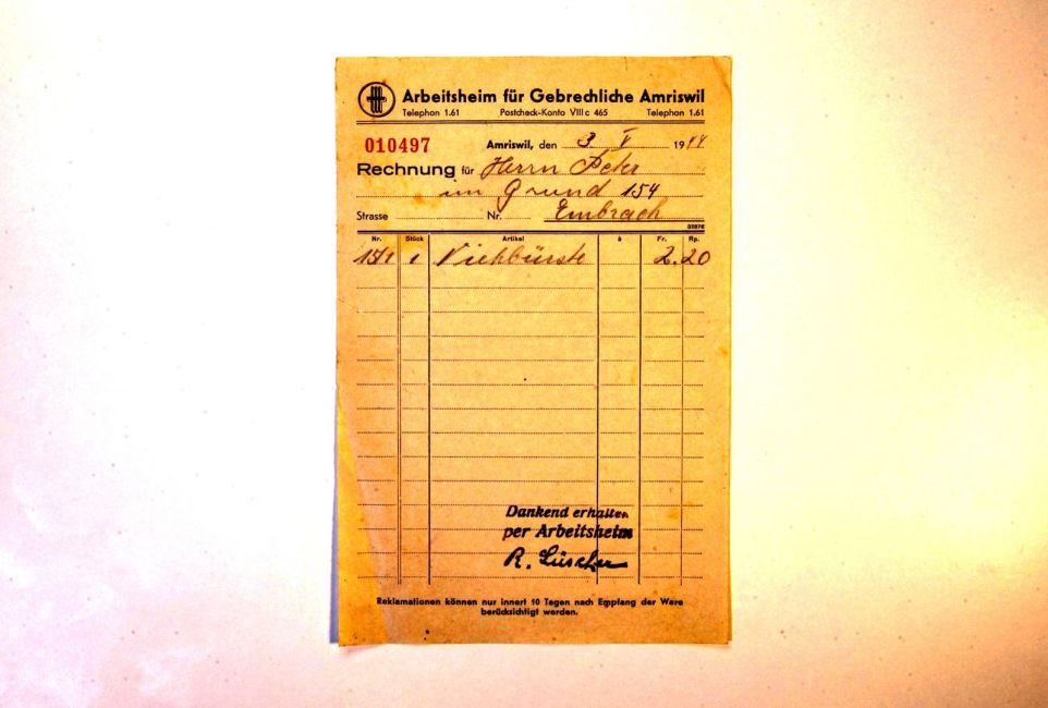 Arbeitsheim für Gebrechliche Amriswil. Viehbürste. Buch WS 49. Quelle: Familienarchiv Peter.