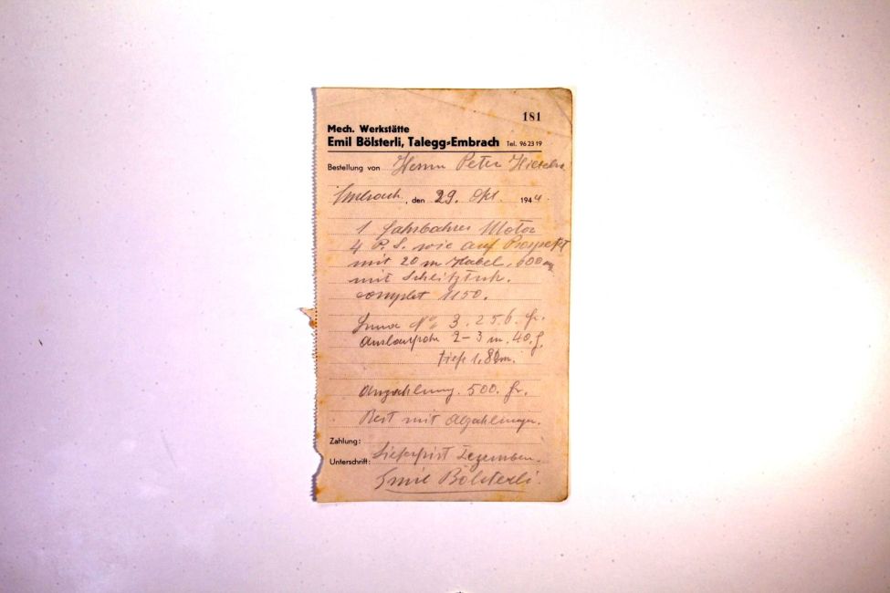 Werkstatt Emil Bölsterli, Talegg. Bestellung fahrbarer Motor, 4 PS, Kabel 20 Meter, komplett Fr. 1150.-, Anzahlung Fr. 500.-