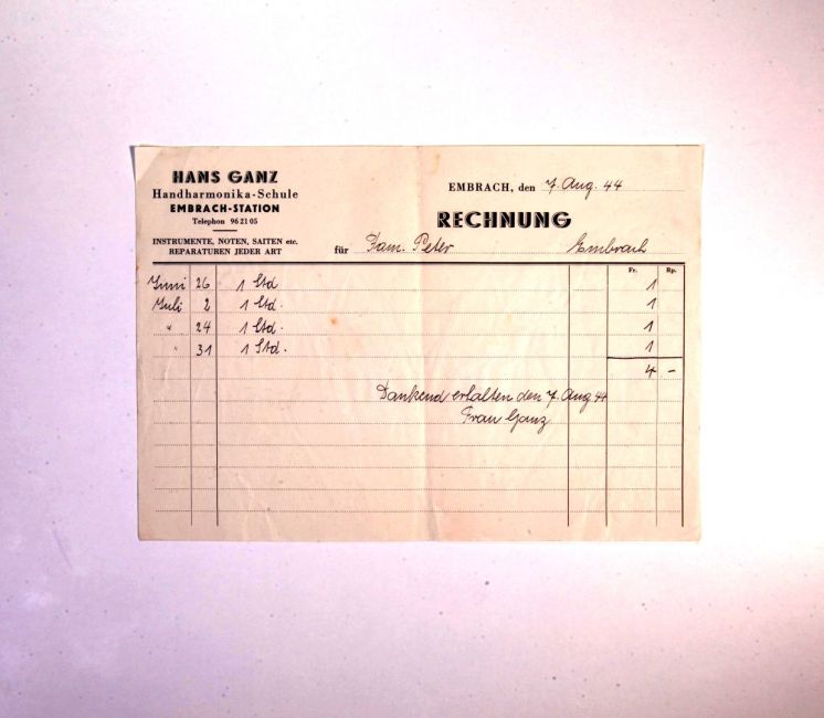 Handharmonikaschule Hans Ganz, Station. Instrumente, Noten, Saiten, Reparaturen. Handorgel. Unterricht für Irma Peter. 1 Stunde 1 Franken. Quelle: Familienarchiv Peter.