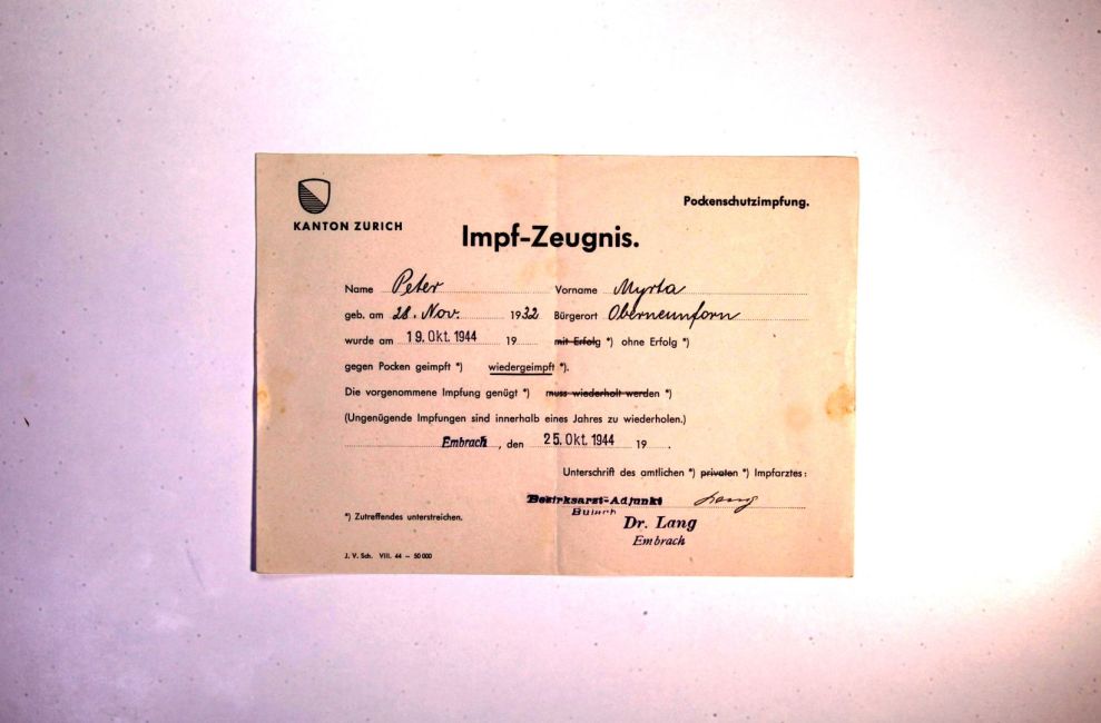 Pockenschutzimpfung, Pockenimpfung von Myrta Peter. Dr. Lang. Impfzeugnis. Buch WS 5. Quelle: Familienarchiv Peter.