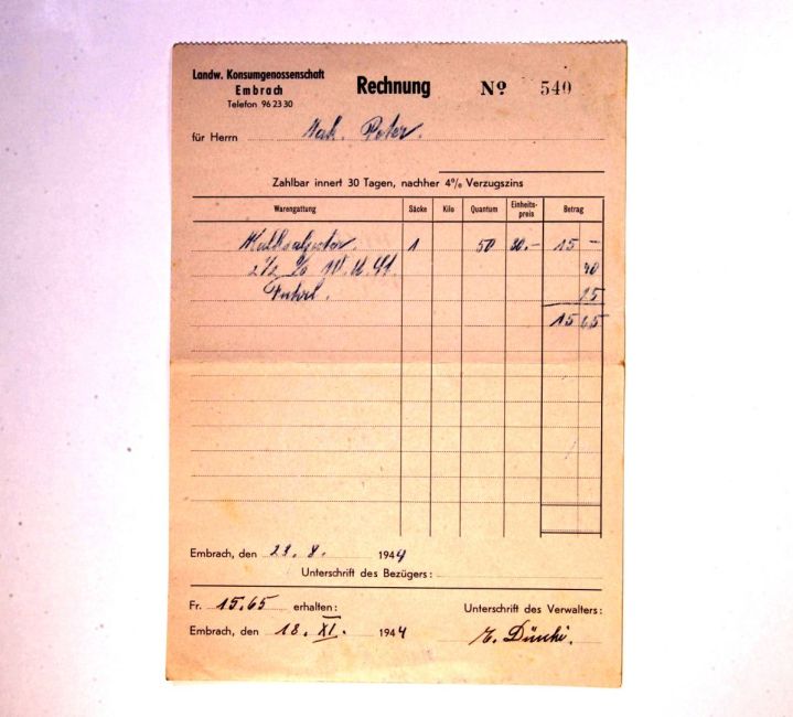 Dünger von der Landwirtschaftlichen Konsumgenossenschaft. Kalksalpeter. Verwalter E. Dünki. Quelle: Familienarchiv Peter.