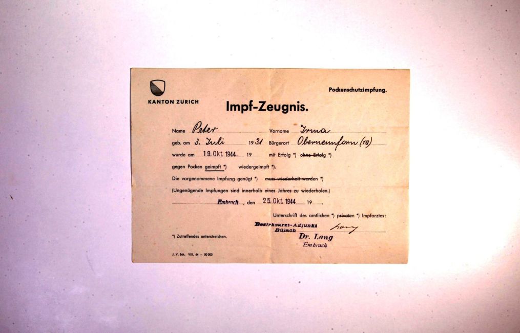 Pockenschutzimpfung. Pockenimpfung von Irma Peter. Dr. Lang, Pfarrhausstrasse 20. Impfzeugnis. Buch WS 6. Quelle: Familienarchiv Peter.