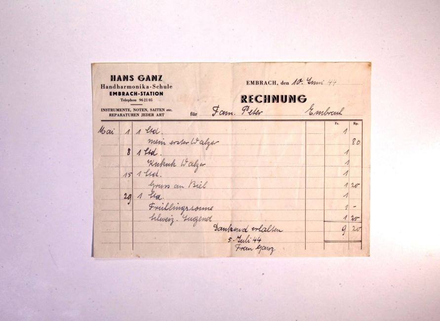 Handharmonikaschule Hans Ganz, Station. Handorgel, Unterricht für Irma Peter. Mein erster Walzer, Kukuk-Walzer, Gruss an Biel, Frühlingssonne, Schweizer Jugend. 1 Stunde 1 Franken, Notenblätter Fr. 0.80 bis 1.20. Quelle: Familienarchiv Peter.