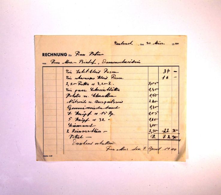 Frau Merz-Bischof, Damenschneiderin, Stationssstrasse 4 (Villa Bosshard / Meier). 1 (?) - Kleid Façon (nach Schnittmustervorlage), 1 schwarzes Kleid Façon, ein Paar Schweissblätter, Polster und Schnallen, Nähseide, Gummimiederband, Knöpfe, Reissverschluss.