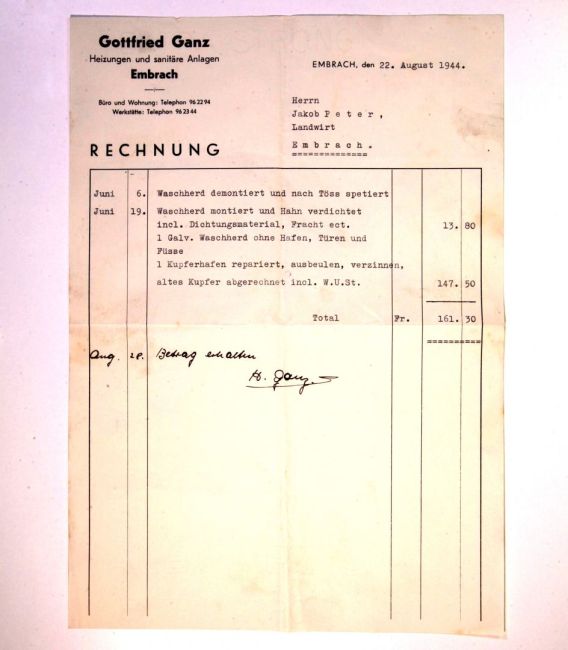 Waschherd und Kupferhafen in der Waschküche repariert durch Gottfried Ganz, Heizungen und sanitäre Anlagen. Stationsstrasse 58. Buch WS 2. Quelle: Familienarchiv Peter.