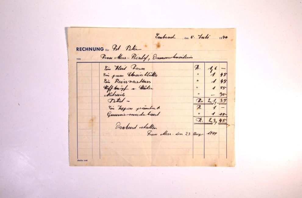Frau Merz-Bischof, Damenschneiderin. Stationsstrasse 4 (Villa Bosshard / Meier)Ein Kleid Façon. Schweissblatt. Reissverschluss. Stoffknöpfe. Nähseide. Gummimiederband. Buch WS 64. Quelle: Familienarchiv Peter. Buch WS 64