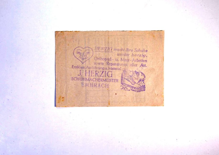 Schuhmacher Herzig macht Ihre Schuhe wieder herzig. Werbung. Werbestempel. Buch Seite 97. Quelle: Familienarchiv. Peter.