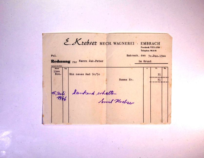 Emil Krebser, mechanische Wagnerei, Hintergasse / Zürcherstrasse 49. Ein neues Rad. Quelle: Familienarchiv Peter.