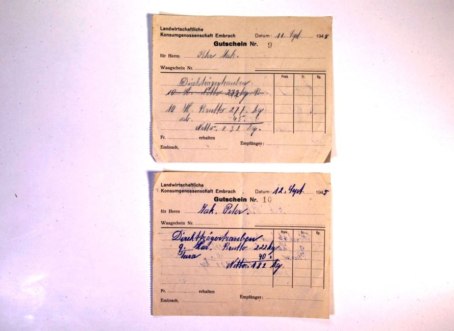 Wümmet. Die Trauben gehen zum Keltern an die Landwirtschaftliche Konsumgenossenschaft. Trauben, Direktträgertrauben. Quelle: Familienarchiv Peter. WS 106
