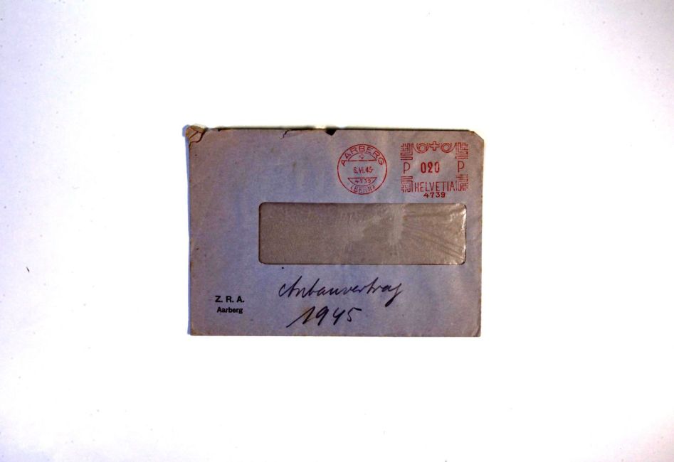 Zuckerfabrik Aarberg. Anbauvertrag. Brief, Kouvert. Schrift von Jakob Peter Sen. Quelle: Familienarchiv Peter