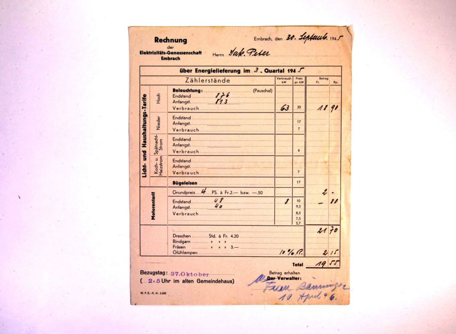 Stromrechnung der Elektrizitätsgenossenschaft für Lichtstrom, Motorenstrom für den neuen Motor der Werkstatt Bölsterli. 3. Quartal. Bezahlt an Frau Bänninger. Quelle: Familienarchiv Peter.