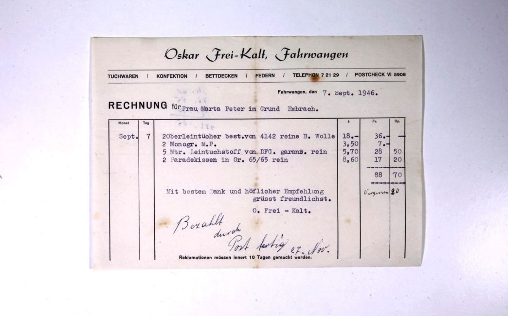 Aussteuer für Marta Peter. Oberleintücher, Monogramm, Leintuchstoff, Leintuch, Paradekissen. Oskar Frei-Kalt, Fahrwangen.