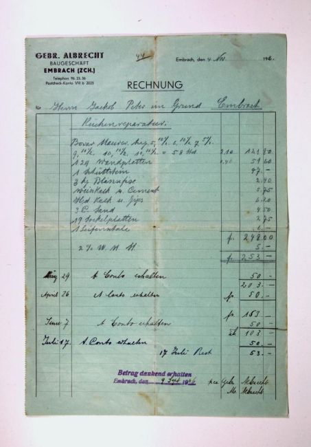 Küchenreparatur durch Baugeschäft Gebrüder Albrecht, Hungerbühlstrasse 7. Maurer Bouvard. Schüttstein, Blancfix, Wandplättli, Weisskalk, Zement, Cement, Gips, Kalk, Sockelplatten, Seifenschalen. Buch WS 29. Quelle: Familienarchiv Peter