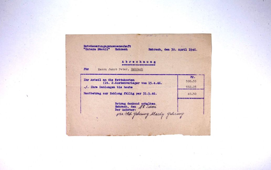Entwässerungsgenossenschaft "unterm Bächli". Abrechnung bezahlt an Marty Gehring für Heinrich Gehring. Quelle: Familienarchiv Peter.